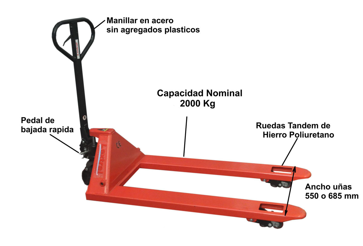 Zorra Hidráulica liviana capacidad nominal max 2000Kg, rango usual de trabajo 1500Kg.